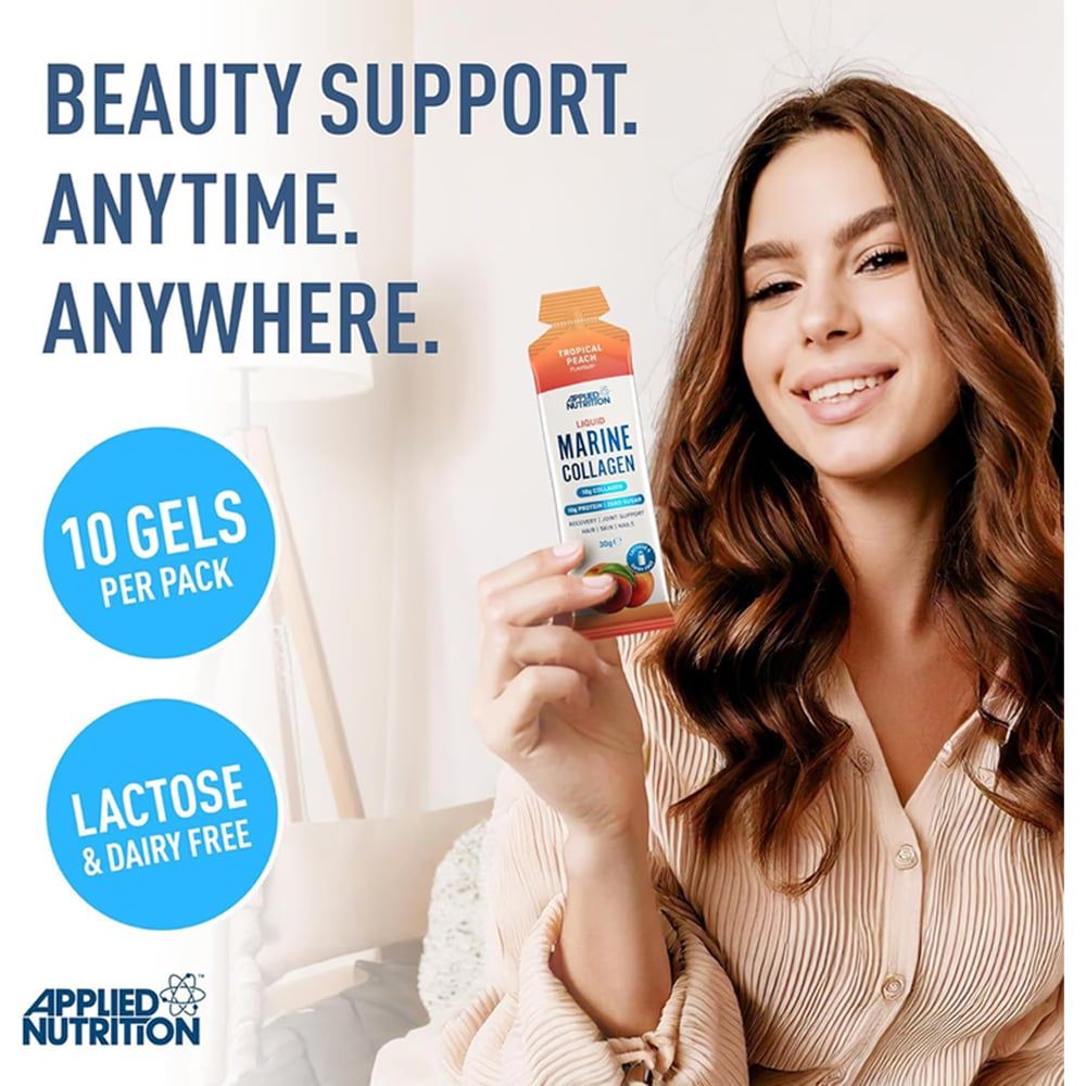 Applied Nutrition Liquid Marine Collagen dạng lỏng uống liền cực kỳ tiện lợi. Mỗi gói chứa 10g Marine Collagen Peptides (collagen thủy phân) chất lượng cao từ cá biển sâu tự nhiên và 10g protein giúp tái tạo độ đàn hồi, trẻ hóa làn da, nuôi dưỡng tóc móng mà còn hỗ trợ duy trì sự linh hoạt, dẻo dai, hỗ trợ xương khớp.
