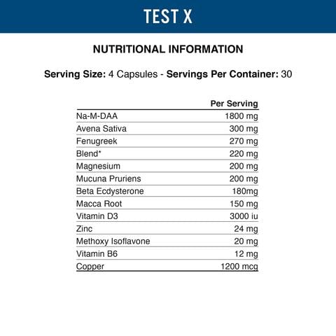 Applied Nutrition Test X sử dụng công thức kết hợp giữa các loại thảo dược quý tự nhiên D-Aspartic Acid, Fenugreek, Ashwagandha, Nhân sâm cùng với vitamin khoáng chất thiết yếu 24mg Kẽm, 200mg Magie, 12mg Vitamin B6, 50mg Vitamin C và 1.2mg Đồng. Sản phẩm có khả năng thúc đẩy thúc đẩy hoạt động nội tiết tự nhiên ở nam giới, hỗ trợ phát triển khối cơ nạc tối ưu, tăng cường năng lượng và sự tập trung, nâng cao hiệu suất tập luyện.