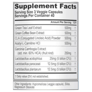 - Green Tea Leaf Extract (500mg): Hỗ trợ tốc độ trao đổi chất và năng lượng để giúp đốt cháy chất béo cũng như tăng mức độ chống oxy hóa. Chứa 60% mức độ cao cấp của EGCG Polyphenol, đây là thành phần chống oxy hóa và hoạt chất quan trọng nhất trong trà xanh.